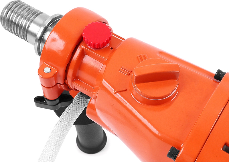 - Наличие трехскоростного редуктора позволяет выбрать оптимальную скорость бурения различных материалов алмазными коронками, а система регулируемой подачи воды в зону бурения не только облегчает сам процесс бурения, но и увеличивает ресурсность алмазных коронок